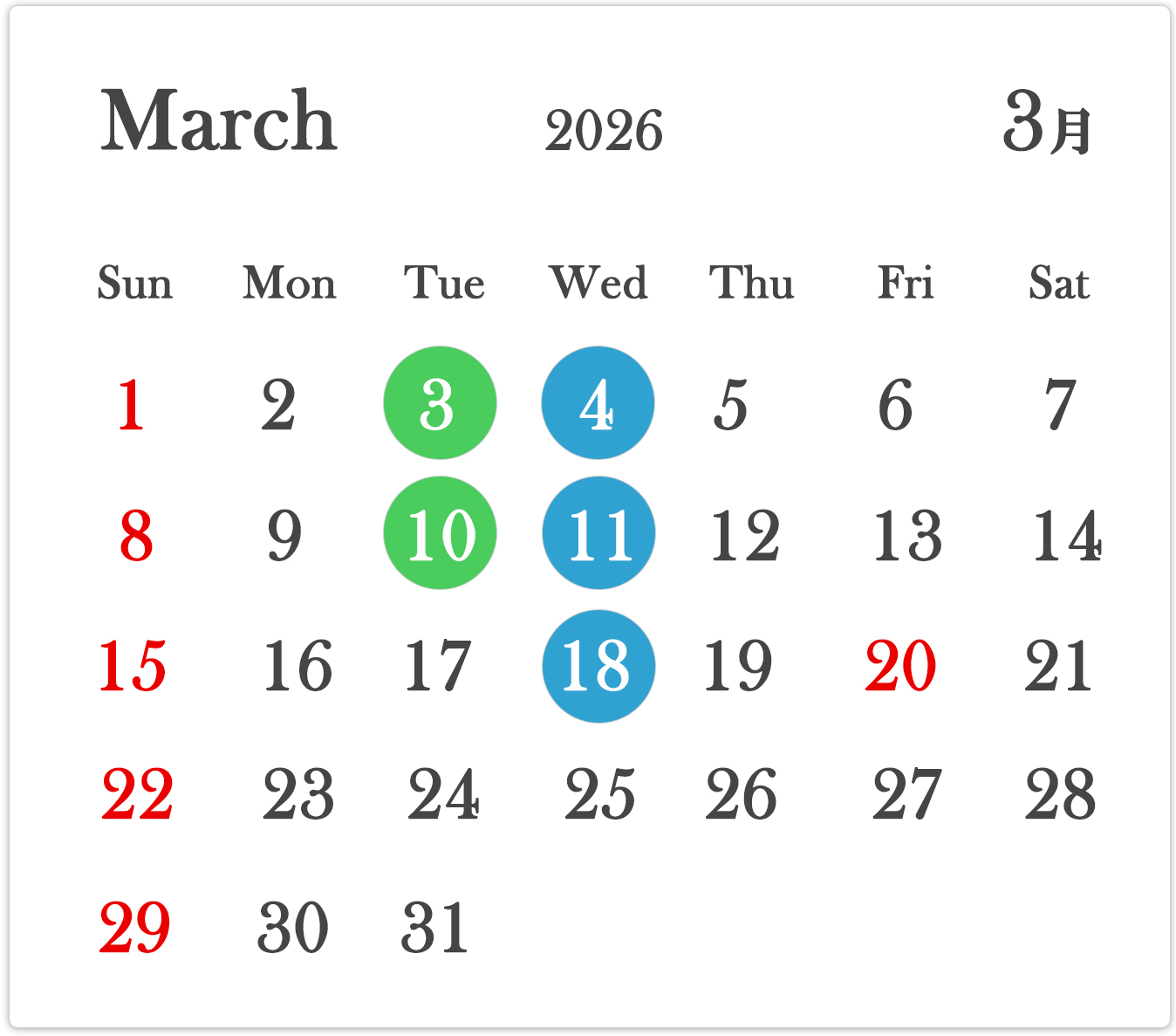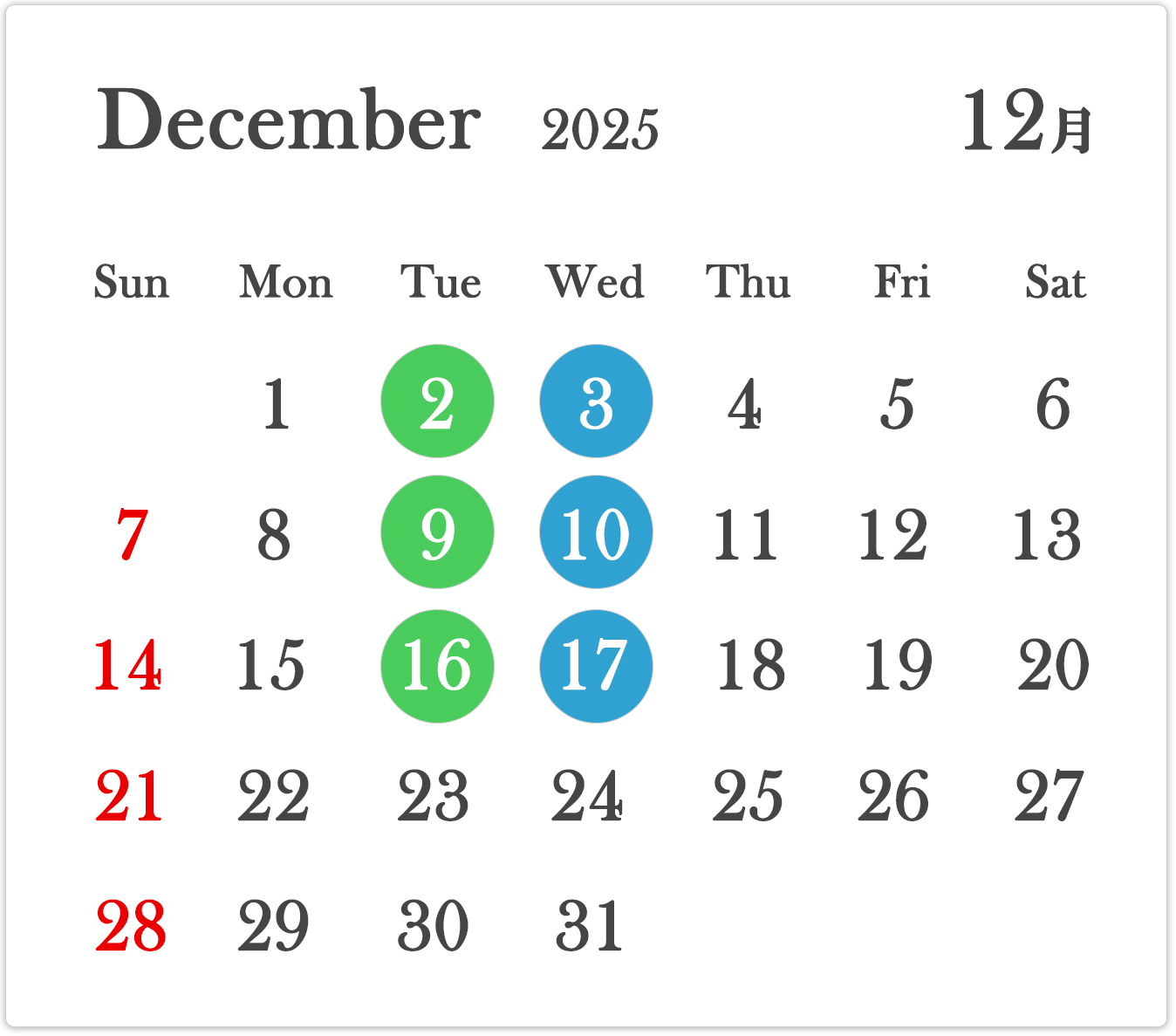 グループA:火曜(緑) / グループB:水曜(青) 各グループ12回