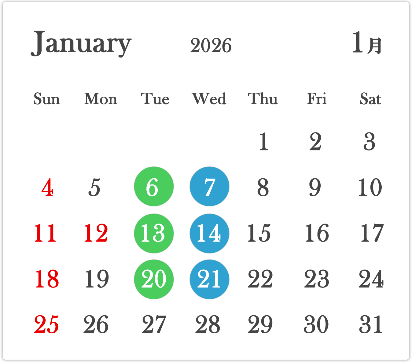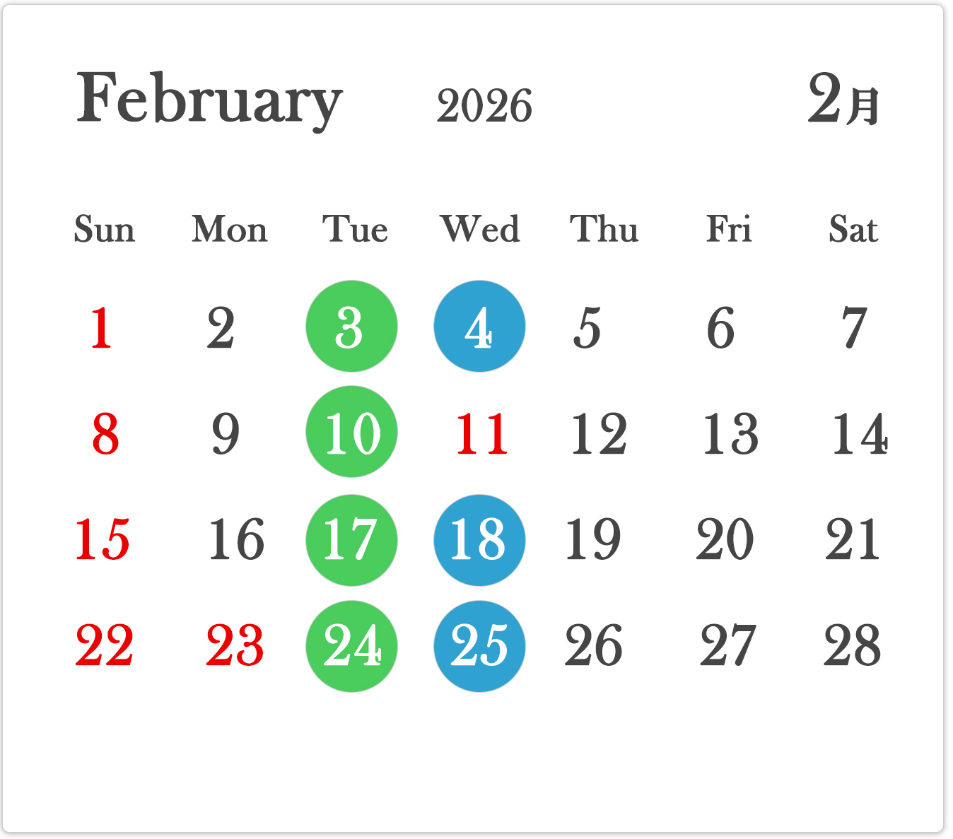 | 実施曜日 | グループA:火曜(緑) / グループB:水曜(青) 各グループ12回 |